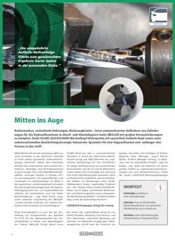 %u201eDie umgekehrte Aufbohr-Reihenfolge f%u00fchrte zum gew%u00fcnschten Ergebnis: kurze Sp%u00e4ne in der passenden Dicke.%u201cMitten ins AugeMEILLER hat sich seit der Gr%u00fcndung 1850 von einer Schmiede in der M%u00fcnchner Vorstadt zu einer global agierenden Unternehmensgruppe entwickelt. Neben dem Stammsitz betreibt das Unternehmen acht weitere Produktions-, Montage- und Vertriebsstandorte in ganz Europa. Die rund 2.000 MEILLER-Mitarbeiter versorgen Kunden in Europa, Afrika und S%u00fcdamerika mit Kippaufbauten und -anh%u00e4ngern f%u00fcr Nutzfahrzeuge. Im Werk in der bayerischen Landeshauptstadt hat neben der Fahrzeug-Endmontage auch die Hydraulikfertigung ihren Sitz. %u201eIm Hydraulikbereich arbeiten wir automatisiert und mit hoher Wertsch%u00f6pfung%u201c, sagt Marc-David Jung, Leiter Industrial Engineering bei MEILLER.%u201eUnsere Kunden erwarten von unseren Produkten hohe Qualit%u00e4t und Zuverl%u00e4ssigkeit.%u201c Diese Zuverl%u00e4ssigkeit ist auch bei der Herstellung von Komponenten aus Baustahl (St 52-3) f%u00fcr das Hydrauliksystem der Verschiebepresse in Abroll- und Absetzkippern ein Thema. MEILLER fertigt davon etwa 25.000 St%u00fcck pro Jahr in unterschiedlichen Varianten. In einem der zahlreichen Arbeitsschritte bringt das MEILLER-Team ein sogenanntes Zylinderauge ein. Die 120 Millimeter lange Stufenbohrung mit zunehmenden Durchmessern von 20, 22 und 25 Millimeternnimmt sp%u00e4ter drei Dichtungen auf und muss eine hohe Oberfl%u00e4cheng%u00fcte aufweisen. Beim automatisierten Aufbohren und anschlie%u00dfenden Reiben mit Werkzeugen eines ISCARMitbewerbers traten regelm%u00e4%u00dfig Probleme auf. %u201eWir hatten immer wieder Parallelit%u00e4tsfehler, durch Sp%u00e4ne auftretende Rattermarken und Werkzeugbr%u00fcche sowie schwankende Oberfl%u00e4chenqualit%u00e4ten%u201c, schildert Andreas Leps, Leiter der Hydraulikproduktion.LOGIQUICK-Kampagne bringt die L%u00f6sungBei einem der regelm%u00e4%u00dfigen Besuche von Detlef Ossadnik, Beratung und Verkauf, und Dirk Moosreiner, technische Beratung und Vertrieb, von MEILLERs langj%u00e4hrigem Werkzeugpartner ISCAR kam die Situation zur Sprache. Sie holten ihre Kollegen Uli K%u00f6hler, Regional Sales Manager, sowie Patrick Muller, Product Manager Drilling, ins Boot.%u201eDas war ein spannendes Projekt%u201c, sagt Uli K%u00f6hler. %u201eVor allem das Material mit seiner gro%u00dfen Vielfalt an Legierungszusammensetzungen war eine Herausforderung.%u201c Dank der neuen LOGIQUICK-Werkzeugkampagne Rattermarken, verlaufende Bohrungen, Werkzeugbr%u00fcche %u2013 beim automatisierten Aufbohren von Zylinderaugen f%u00fcr die Hydrauliksysteme in Abroll- und Absetzkippern hatte MEILLER mit gro%u00dfen Herausforderungen zu k%u00e4mpfen. Dank ISCARs QUICK3CHAM-Wechselkopf-Bohrsystem mit speziellem Aufbohr-Kopf sowie einer unkonventionellen Bearbeitungsstrategie bekam der Spezialist f%u00fcr Lkw-Kippaufbauten und -anh%u00e4nger den Prozess in den Griff.SHORTCUTAUFGABE: Aufbohren eines Zylinderauges L%u00d6SUNG: Drei QUICK3CHAMWechselkopfbohrer mit speziellem F3B-Bohrkopf zum AufbohrenNUTZEN: Hohe Oberfl%u00e4cheng%u00fcte, Verlaufsfreiheit, Prozesssicherheiti26