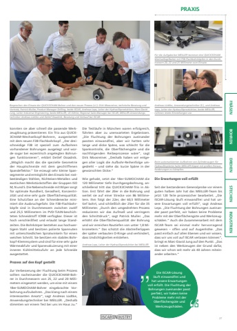 PRAXISFR%u00c4SEN BOHREN DREHEN STECHEN INDUSTRIENBeim automatisierten Aufbohren von Zylinderaugen f%u00fcr Hydrauliksysteme hatte MEILLER Kipper mit gro%u00dfen Herausforderungen zu k%u00e4mpfen.Besprechen den Einsatz der QUICK3CHAM-Bohrer und den neuen Prozess (v.l.): Dirk Moosreiner, technische Beratung und Vertrieb, Patrick Muller, Product Manager Drilling, beide ISCAR, Andreas Leps, Leiter der Hydraulikproduktion, Marc-David Jung, Leiter Industrial Engineering, beide MEILLER, Uli K%u00f6hler, Regional Sales Manager bei ISCAR, MEILLER-Anwendungstechniker Andreas L%u00fcdtke und Detlef Ossadnik, Beratung und Verkauf bei ISCAR. konnten sie aber schnell die passende Werkzeugl%u00f6sung pr%u00e4sentieren: Ein Trio aus QUICK3CHAM-Wechselkopf-Bohrern, ausgestattetmit dem neuen F3B-Flachbohrkopf. %u201eDer dreischneidige F3B ist speziell zum Aufbohren vorhandener Bohrungen ausgelegt und w%u00fcrde sogar bei exzentrisch angelegten Bohrungen funktionieren%u201c, erkl%u00e4rt Detlef Ossadnik.%u201eM%u00f6glich macht das die spezielle Geometrie der Hauptschneide mit dem geschliffenen Spandeflektor.%u201c Sie erzeugt sehr kleine Spansegmente und erm%u00f6glicht den Einsatz bei rostbest%u00e4ndigen St%u00e4hlen, Nichteisen-Metallen und exotischen Werkst%u00fcckstoffen der Gruppen ISO M, N und S. Die Nebenschneide mit Wiper sorgt f%u00fcr optimale Rundheit, Geradheit, Konzentrizit%u00e4t und eine sehr gute Oberfl%u00e4chenqualit%u00e4t.Eine Schutzfase an der Schneidenecke minimiert die Ausbruchgefahr. Die F3B-Flachbohrk%u00f6pfe sind in Durchmessern zwischen zw%u00f6lf und 25,5 Millimetern im PVD-TiAIN-beschichteten Schneidstoff IC908 verf%u00fcgbar. Dieser ist hoch verschlei%u00dffest und erlaubt lange Standzeiten. Die Bohrk%u00f6rper bestehen aus hochwertigem Stahl und besitzen polierte Spannuten mit unterschiedlichen Spiralwinkeln f%u00fcr einen weichen Schnitt. Sie besitzen ein stabiles Bohrkopf-Klemmsystem und sind f%u00fcr eine sehr gute W%u00e4rmeabfuhr und Spanevakuierung mit einer inneren K%u00fchlmittelzufuhr an jede Schneide ausgestattet.Prozess auf den Kopf gestelltZur Verbesserung der Fluchtung beim Prozess sollten nacheinander die QUICK3CHAM-Bohrer in Durchmessern von 25, 22 und 20 Millimetern eingesetzt werden, um eine mit einem 18er-SUMOCHAM-Bohrer eingebrachte Vorbohrung aufzubohren. %u201eDas klang nach einem interessanten Ansatz%u201c, sagt Andreas L%u00fcdtke, Anwendungstechniker bei MEILLER. %u201eDeshalb stimmten wir einem Test bei uns im Haus zu.%u201cF%u00fcr die Aufgabe bei MEILLER kommen drei QUICK3CHAMWechselkopfboher mit F3B-Flachbohrk%u00f6pfen in den Durchmessern 20, 22 und 25 Millimeter zum Einsatz.Andreas Leps, Leiter der Hydraulikproduktion bei MEILLERDie ISCAR-L%u00f6sung l%u00e4uft einwandfrei und hat unsere Erwartungen voll erf%u00fcllt. Die Fluchtung der Bohrungen zueinander passt perfekt, wir haben keine Probleme mehr mit der Oberfl%u00e4cheng%u00fcte und Werkzeugsch%u00e4den.Die Testl%u00e4ufe in M%u00fcnchen waren erfolgreich, f%u00fchrten aber zu unerwarteten Ergebnissen.%u201eDie Fluchtung der Bohrungen zueinander passten einwandfrei, aber wir hatten sehr lange und dicke Sp%u00e4ne, was schlecht f%u00fcr die Spankontrolle, die Oberfl%u00e4cheng%u00fcte und die nachfolgenden Reibeprozesse w%u00e4re%u201c, sagt Dirk Moosreiner. %u201eDeshalb haben wir entgegen aller Logik die Aufbohr-Reihenfolge umgedreht %u2013 und siehe da: kurze Sp%u00e4ne in der gew%u00fcnschten Dicke.%u201c Wie gehabt, setzt der 18er-SUMOCHAM die 120 Millimeter tiefe Durchgangsbohrung, anschlie%u00dfend tritt das QUICK3CHAM-Trio in Aktion. Erst f%u00e4hrt der 20er in die Bohrung und weitet sie auf einer Strecke von 86 Millimetern. Ihm folgt der 22er, der 60,5 Millimeter tief bohrt, und schlie%u00dflich der 25er f%u00fcr die 35 Millimeter. %u201eDurch den umgedrehten Prozess reduzieren wir das Aufma%u00df und verringern den Schnittdruck%u201c, sagt Patrick Muller. %u201eDas erh%u00f6ht die Oberfl%u00e4chenqualit%u00e4t der Bohrung und wir erreichen Rautiefen von unter 1,8 Mikrometern.%u201c Das sch%u00fctzt die Abstreiferlippen der sp%u00e4ter verbauten O-Ringe und verhindert, dass Undichtigkeiten entstehen.Andreas L%u00fcdtke, Anwendungstechniker (li.), und AndreasLeps, Leiter der Hydraulikproduktion, beide MEILLER, nehmen letzte Einstellungen vor.Die Erwartungen voll erf%u00fclltSeit der bestandenen Generalprobe vor einem guten halben Jahr hat das MEILLER-Team bis jetzt 120 Teile prozesssicher bearbeitet. %u201eDie ISCAR-L%u00f6sung l%u00e4uft einwandfrei und hat unsere Erwartungen voll erf%u00fcllt%u201c, sagt Andreas Leps. %u201eDie Fluchtung der Bohrungen zueinander passt perfekt, wir haben keine Probleme mehr mit der Oberfl%u00e4cheng%u00fcte und Werkzeugsch%u00e4den.%u201c Auch die Zusammenarbeit mit dem ISCAR-Team sei einmal mehr hervorragend gewesen %u2013 offen und auf Augenh%u00f6he. %u201eDas passt einfach auf allen Ebenen und wir wissen, dass wir uns voll auf ISCAR verlassen k%u00f6nnen%u201c, bringt es Marc-David Jung auf den Punkt. %u201eDas ist neben den Werkzeugen der Grund daf%u00fcr, dass wir schon seit mehr als 40 Jahren miteinander arbeiten.%u201c27