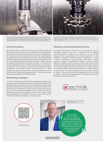 Volker Labrenz, Vertriebstechniker, ISCAR Austria GmbHDieses Projekt zeigt, was m%u00f6glichist, wenn man Werkzeug, Maschine und Anwendung von Anfang an gemeinsam denkt.Vegu hat den Mut gehabt, neue Wege zu gehen %u2013 und wir freuen uns, sie mit unserem Know-how und den passenden Werkzeugl%u00f6sungen dabei zu begleiten.Exakte 90-Grad-SchulternDie restlichen Fl%u00e4chen werden bei Vegu mit dem Eckfr%u00e4ser HM390 FTP D50-JHP gefertigt. Das System aus der HELI3MILL-Serie %u00fcberzeugt mit einem deutlich geringeren Schnittdruck als klassische APKT-Systeme %u2013 ein Vorteil, der nicht nur die Maschine schont, sondern auch die Bauteilgenauigkeit bei d%u00fcnnwandigen Konturen steigert. %u201eDer HM390 erzeugt exakte 90-Grad-Schultern und verf%u00fcgt %u00fcber drei Schneidkanten je Platte, was die Wirtschaftlichkeit zus%u00e4tzlich verbessert%u201c, betont Labrenz.Die gezielte K%u00fchlmittelzufuhr der JHP-Linie (Anm.: im 3D-Druck-Verfahren hergestellt) reduziert die W%u00e4rmeentwicklung in der Schnittzone signifikant und f%u00fchrt dadurch zu einer deutlich verl%u00e4ngerten Werkzeugstandzeit. Der modulare Aufbau des Eckfr%u00e4ssystems von ISCAR erm%u00f6glicht Eins%u00e4tze mit Durchmessern acht bis 200 Millimeter mit sechs unterschiedlichen Wendeschneidplattengr%u00f6%u00dfen %u2013 ideal f%u00fcr variierende Bearbeitungsstrategien in der Serienfertigung.Nutbearbeitung im DoppelpackIn einem der Bauteile m%u00fcssen auch Nuten eingebracht werden. Dazu setzt Vegu den Scheibenfr%u00e4ser SDN D125 aus der TANGSLOT-Familie ein.Das Werkzeugpaket, bestehend aus zwei dreiseitig schneidenden Scheibenfr%u00e4sern, bearbeitet bei Vegu simultan zwei Nuten mit sieben Millimtern Breite und 25 Millimetern Tiefe in einem einzigen Bearbeitungsschritt. %u201eDie innovativen Schneidengeometrien und die vier nutzbaren Schneidkanten pro Platte erm%u00f6glichen einen weichen Schnitt, senken den Leistungsbedarf der Maschine und erzielen eine hohe Prozesssicherheit auch bei tiefer Zustellung%u201c, so Labrenz weiter.Zukunftssicher durch partnerschaftliche EntwicklungF%u00fcr Vegu markiert dieses Projekt nicht nur den Einstieg in die Fr%u00e4stechnologie, sondern auch einen wichtigen Schritt in Richtung hochautomatisierter Fertigung. Die Investition in die HermleAnlage und das Zusammenspiel mit ISCAR erm%u00f6glichen eine wirtschaftliche Produktion sicherheitskritischer Komponenten %u2013 %u201eMade in Austria%u201c, prozesssicher und hochpr%u00e4zise. %u201eWir sehen in dieser L%u00f6sung ein absolut zukunftsf%u00e4higes Modell%u201c, res%u00fcmiert Dominik Velikonja. %u201eProjekte wie diese k%u00f6nnen nur durch eine optimale Auslegung der Fertigungsl%u00f6sung inklusive Bearbeitungsstrategie funktionieren. Mit dem Ergebnis bin ich sehr zufrieden, nicht zuletzt aufgrund der ausgezeichneten Betreuung seitens ISCAR mit entsprechendem Fr%u00e4s-Know-how.%u201c Die n%u00e4chste Hallenerweiterung bei Vegu ist bereits im Gange %u2013 mit dem Ziel, zus%u00e4tzliche Kapazit%u00e4ten f%u00fcr neue Projekte zu schaffen. Die intensive Zusammenarbeit mit ISCAR wird dabei auch k%u00fcnftig eine wichtige Rolle spielen.Video zur ReportageSchruppen, schlichten, schultern: Der Eckfr%u00e4ser HM390 FTP D50 von ISCAR bringt exakte 90-Grad-Schultern, geringe Schnittkr%u00e4fte und hohe Wirschaftlichkeit direkt an das Bauteil %u2013optimal abgestimmt auf die Anforderungen der automatisierten Fertigung bei Vegu.Der FDN D125 Scheibenfr%u00e4ser im Nahblick %u2013 mit geschliffenen Schneiden, innovativer Geometrie und vier nutzbaren Schneidkanten ideal f%u00fcr pr%u00e4zise Nutbearbeitungen bei minimalem Schnittdruck.8