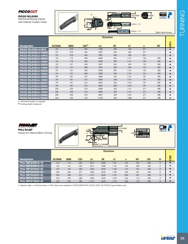 TURNING23LFDCONMSCDXA6%u00b0 45%u00b06%u00b07%u00b0 DMINREaWFALU.008DMIN%u2265.118DMIN<.118 Right-hand shownDimensionsDesignation DCONMS DMIN CDX(1) LU RE LF a WF IC908PICCO R/LX050.2-5R15 .157 .079 .004 .1969 .006 .748 .071 - %u2022 PICCO R/LX050.2-10R05 .157 .079 .004 .3937 .002 .945 .071 - %u2022 PICCO R/LX050.2-10R15 .157 .079 .004 .3937 .006 .945 .071 - %u2022 PICCO R/LX050.3-16R10 .157 .118 .006 .6299 .004 1.181 .106 .028 %u2022 PICCO R/LX050.3-16R20 .157 .118 .006 .6299 .008 1.181 .106 .028 %u2022 PICCO R/LX050.4-10R10 .157 .157 .008 .3937 .004 .945 .142 .063 %u2022 PICCO R/LX050.4-10R20 .157 .157 .008 .3937 .008 .945 .142 .063 %u2022 PICCO R/LX050.4-16R10 .157 .157 .008 .6299 .004 1.181 .142 .063 %u2022 PICCO R/LX050.4-16R20 .157 .157 .008 .6299 .008 1.181 .142 .063 %u2022 PICCO R/LX050.5-15R10 .197 .197 .012 .5906 .004 1.181 .181 .083 %u2022 PICCO R/LX050.5-15R20 .197 .197 .012 .5906 .008 1.181 .181 .083 %u2022 PICCO R/LX050.5-25R10 .197 .197 .012 .9842 .004 1.575 .181 .083 %u2022 PICCO R/LX050.5-25R20 .197 .197 .012 .9842 .008 1.575 .181 .083 %u2022 PICCO R/LX050.6-15R10 .236 .236 .016 .5906 .004 1.181 .217 .098 %u2022 PICCO R/LX050.6-15R20 .236 .236 .016 .5906 .008 1.181 .217 .098 %u2022 PICCO R/LX050.6-22R20 .236 .236 .016 .8661 .008 1.457 .217 .098 %u2022 PICCO R/LX050.6-35R20 .236 .236 .016 1.3780 .008 1.968 .217 .098 %u2022 %u2022 Left-hand inserts on request(1) Cutting depth maximum PICCO R/LX050Reinforced Boring Inserts with Internal Coolant HolesDMINDCONMSaREWFCWLU3%u00b0 30%u00b0LFCDXDimensionsDesignation DCONMS DMIN CDX LU RE LF a WF CW IH IC908PICJ RBTD30R10-15 .157 .118 .020 .5512 .0039 1.181 .102 .024 .059 R %u2022 PICJ RBTD40R15-15 .157 .157 .032 .5512 .0059 1.181 .138 .059 .059 R %u2022 PICJ RBTD50R20-20 .197 .197 .039 .7480 .0079 1.378 .173 .075 .059 R %u2022 PICJ RBTD60R20-20 .236 .236 .071 .7480 .0079 1.378 .209 .091 .059 R %u2022 PICJ RBTD60R20-30 .236 .236 .071 1.1417 .0079 1.772 .209 .091 .059 R %u2022 PICJ RBTD70R20-20 .276 .276 .098 .7480 .0079 1.378 .248 .110 .059 R %u2022 PICJ RBTD70R20-30 .276 .276 .098 1.1417 .0079 1.772 .248 .110 .059 R %u2022%u2022 Specify right- or left-hand bars %u2022 PICJ items are suitable for PICCO/MG PCO, PICCO ACE, SC-PICCO type holders onlyPICJ R/LBTInserts for Internal Back Turning