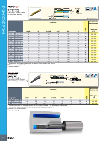 FACE GROOVING32 ISCARCWaLFLUDCONMSDAXN RE.008RE.008.287Right-hand shownPSI MaxDimensions Recommended Machining DataDesignation DAXN(1) CW DCONMS OHN(2) OAL a IC1008f face-groove(IPR)PICCO R 016.0300-10 .63 .118 .315 .39 1.181 .217 %u2022 .0004-.0020PICCO R 016.0300-20 .63 .118 .315 .79 1.575 .217 %u2022 .0004-.0020PICCO R 016.0400-10 .63 .157 .315 .39 1.181 .236 %u2022 .0004-.0020PICCO R 016.0400-20 .63 .157 .315 .79 1.575 .236 %u2022 .0004-.0020PICCO R 020.0300-25 .79 .118 .315 .98 1.772 .217 %u2022 .0004-.0020PICCO R 020.0300-30 .79 .118 .315 1.18 1.968 .217 %u2022 .0004-.0016PICCO R 020.0300-35 .79 .118 .315 1.38 2.165 .217 %u2022 .0004-.0016PICCO R 020.0300-40 .79 .118 .315 1.57 2.362 .217 %u2022 .0004-.0016PICCO R 020.0400-25 .79 .157 .315 .98 1.772 .236 %u2022 .0004-.0024PICCO R 020.0400-30 .79 .157 .315 1.18 1.968 .236 %u2022 .0004-.0024PICCO R 020.0400-35 .79 .157 .315 1.38 2.165 .236 %u2022 .0004-.0020PICCO R 020.0400-40 .79 .157 .315 1.57 2.362 .236 %u2022 .0004-.0020PICCO R 020.0500-20 .79 .197 .315 .79 1.575 .256 %u2022 .0008-.0024PICCO R 020.0500-25 .79 .197 .315 .98 1.772 .256 %u2022 .0008-.0024PICCO R 020.0500-30 .79 .197 .315 1.18 1.968 .256 %u2022 .0008-.0024PICCO R 020.0500-35 .79 .197 .315 1.38 2.165 .256 %u2022 .0008-.0020PICCO R 020.0500-40 .79 .197 .315 1.57 2.362 .256 %u2022 .0008-.0020%u2022 All inserts have two coolant holes which may be used with coolant pressure up to 1450 PSI(1) Minimum axial grooving diameter (2) Minimum overhang PICCO-016/020(Face Grooving)Inserts with Coolant Channel for Deep Face GroovingaCW OHNDCONMSOALDAXNCDXCWDimensions Recommended Machining DataDesignation DAXN(1) CW CDX DCONMS OHN(2) OAL a IC908f face-groove(IPR)PICJ RF25D8T20-20 .31 .098 .748 .276 .79 1.378 .232 %u2022 .0004-.0016PICJ RF30D8T20-20 .31 .118 .748 .276 .79 1.378 .232 %u2022 .0008-.0020PICJ RF30D8T30-30 .31 .118 1.142 .276 1.18 1.772 .232 %u2022 .0004-.0016%u2022 Only right-hand inserts are available as standard, left-hand inserts on request %u2022 All inserts are with sharp corners%u2022 PICJ items are suitable for PICCO/MG PCO, PICCO ACE, SC-PICCO types holders only(1) Minimum axial grooving diameter (2) Minimum overhang PICJ RF-D8-T (Face Grooving)Inserts with Internal Coolant Channel for Deep Face Grooving