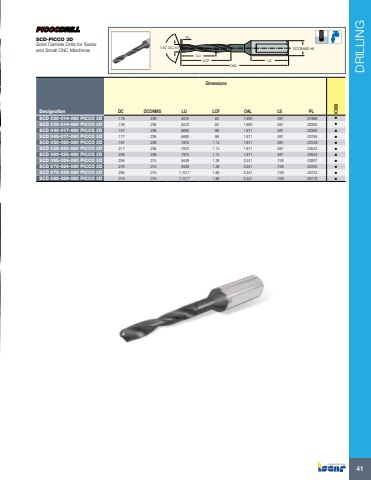 DRILLING41DCONMS h6OALLCF LSDC m7LUPL140%u02daDimensionsDesignation DC DCONMS LU LCF OAL LS PL IC908SCD 030-014-060 PICCO 3D .118 .236 .5512 .83 1.693 .591 .01968 %u2022 SCD 035-014-060 PICCO 3D .138 .236 .5512 .83 1.693 .591 .02362 %u2022 SCD 040-017-060 PICCO 3D .157 .236 .6693 .98 1.811 .591 .02362 %u2022 SCD 045-017-060 PICCO 3D .177 .236 .6693 .98 1.811 .591 .02755 %u2022 SCD 050-020-060 PICCO 3D .197 .236 .7874 1.14 1.811 .591 .03149 %u2022 SCD 055-020-060 PICCO 3D .217 .236 .7874 1.14 1.811 .591 .03543 %u2022 SCD 060-020-060 PICCO 3D .236 .236 .7874 1.14 1.811 .591 .03543 %u2022 SCD 065-024-080 PICCO 3D .256 .315 .9449 1.38 2.441 .748 .03937 %u2022 SCD 070-024-080 PICCO 3D .276 .315 .9449 1.38 2.441 .748 .04330 %u2022 SCD 075-029-080 PICCO 3D .295 .315 1.1417 1.65 2.441 .748 .04724 %u2022 SCD 080-029-080 PICCO 3D .315 .315 1.1417 1.65 2.441 .748 .05118 %u2022SCD-PICCO 3DSolid Carbide Drills for Swiss and Small CNC Machines