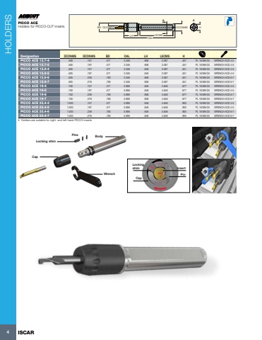 HOLDERS4 ISCARDCONMSOALLSCMSHLHBD DCONWSA ADesignation DCONMS DCONWS BD OAL LH LSCMS HPICCO ACE 12.7-4 .500 .157 .571 3.346 .906 2.087 .457 PL 16 M6-D5 WRENCH ACE 4-5PICCO ACE 12.7-5 .500 .197 .571 3.346 .906 2.087 .457 PL 16 M6-D5 WRENCH ACE 4-5PICCO ACE 15.9-4 .625 .157 .571 3.346 .846 2.087 .551 PL 16 M6-D5 WRENCH ACE 4-5PICCO ACE 15.9-5 .625 .197 .571 3.346 .846 2.087 .551 PL 16 M6-D5 WRENCH ACE 4-5PICCO ACE 15.9-6 .625 .236 .783 3.346 .906 2.087 .551 PL 16 M6-D5 WRENCH ACE 6-7PICCO ACE 15.9-7 .625 .276 .783 3.346 .906 2.087 .551 PL 16 M6-D5 WRENCH ACE 6-7PICCO ACE 19-4 .750 .157 .571 5.906 .846 4.646 .677 PL 16 M6-D5 WRENCH ACE 4-5PICCO ACE 19-5 .750 .197 .571 5.906 .846 4.646 .677 PL 16 M6-D5 WRENCH ACE 4-5PICCO ACE 19-6 .750 .236 .783 5.906 .906 4.646 .677 PL 16 M6-D5 WRENCH ACE 6-7PICCO ACE 19-7 .750 .276 .783 5.906 .906 4.646 .677 PL 16 M6-D5 WRENCH ACE 6-7PICCO ACE 25.4-4 1.000 .157 .571 5.906 .846 4.646 .905 PL 16 M6-D5 WRENCH ACE 4-5PICCO ACE 25.4-5 1.000 .197 .571 5.906 .846 4.646 .905 PL 16 M6-D5 WRENCH ACE 4-5PICCO ACE 25.4-6 1.000 .236 .783 5.906 .846 4.646 .905 PL 16 M6-D5 WRENCH ACE 6-7PICCO ACE 25.4-7 1.000 .276 .783 5.906 .846 4.646 .905 PL 16 M6-D5 WRENCH ACE 6-7%u2022 Holders are suitable for right- and left-hand PICCO insertsCapWrenchLocking shimBody PinsLocking shimCapInsertPinPICCO ACEHolders for PICCO-CUT Inserts