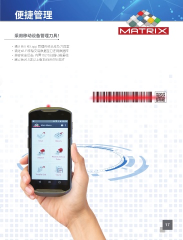 便捷管理 采用移动设备管理刀具! •通过MATRIX app 管理传统仓库及刀具室 •通过Wi-Fi传输交易数据至已连网数据库 •兼容安卓设备,内置1D/2D扫描功能最佳 •需安装V6.5或以上版本的MATRIX软件 17