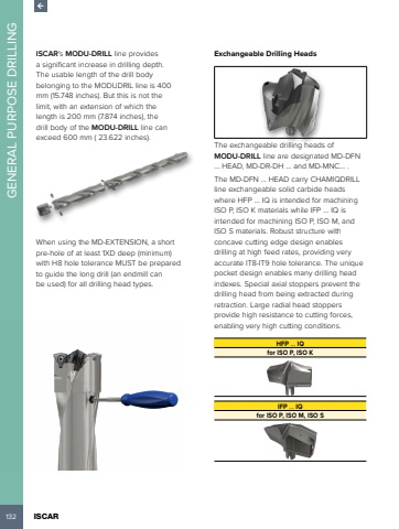 132 ISCAR GENERAL PURPOSE DRILLINGISCAR's MODU-DRILL line provides a significant increase in drilling depth. The usable length of the drill body belonging to the MODUDRIL line is 400 mm (15.748 inches). But this is not the limit, with an extension of which the length is 200 mm (7.874 inches), the drill body of the MODU-DRILL line can exceed 600 mm ( 23.622 inches). When using the MD-EXTENSION, a short pre-hole of at least 1XD deep (minimum) with H8 hole tolerance MUST be prepared to guide the long drill (an endmill can be used) for all drilling head types.Exchangeable Drilling HeadsThe exchangeable drilling heads of MODU-DRILL line are designated MD-DFN %u2026 HEAD, MD-DR-DH %u2026 and MD-MNC%u2026 .The MD-DFN %u2026 HEAD carry CHAMIQDRILL line exchangeable solid carbide heads where HFP %u2026 IQ is intended for machining ISO P, ISO K materials while IFP %u2026 IQ is intended for machining ISO P, ISO M, and ISO S materials. Robust structure with concave cutting edge design enables drilling at high feed rates, providing very accurate IT8-IT9 hole tolerance. The unique pocket design enables many drilling head indexes. Special axial stoppers prevent the drilling head from being extracted during retraction. Large radial head stoppers provide high resistance to cutting forces, enabling very high cutting conditions. HFP %u2026 IQ for ISO P, ISO KIFP %u2026 IQfor ISO P, ISO M, ISO S