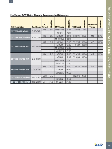 161PRE-THREAD DRILLING WITH CHAMFERING Pre-Thread DCT Metric Threads Recommended DiametersDrill Designation Dia. RangeMThread Head Dia.MF Thread Head Dia.TR Thread Head Dia.M Helicoil Thread Head Dia.DCT 068-021-14B-M8 6.80-7.49M8 6.8 MF8X0.75 7.20 TR10X3 7.49MF8X1 7.00DCT 085-026-14B-M10 8.30-8.99M10 8.5 MF10X1 8.99 TR10X1.5 8.60 M8 8.40MF10X1.25 8.80DCT 102-030-14B-M12 10.0-10.99M12 10.2 MF11X1 10.00 TR12X2 10.20 M10 10.50MF12X1 10.99 TR14X4 10.50MF12X1.25 10.80MF12X1.5 10.50DCT 120-035-16B-M14 12.0-12.99M14 12.0 MF13X1 12.00 TR14X2 12.20 M12 12.50MF14X1 12.99 TR16X4 12.30MF14X1.25 12.80MF14X1.5 12.50DCT 140-039-18B-M16 14.0-14.99M16 14.0 MF14X1 14.00 TR18X4 14.30 M14 14.99MF16X1 14.99MF16X1.5 14.50DCT 175-042-20B-M20 17.3-17.99M20 17.5 TR22X5 17.30MF20X2 17.99DCT 210-048-25B-M24 21.0-21.99 M24 21.0 MF22X1 21.00