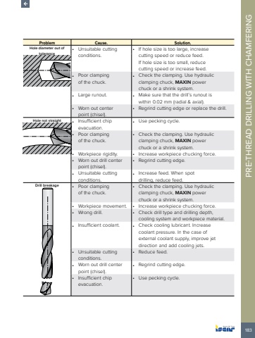 183PRE-THREAD DRILLING WITH CHAMFERING Problem Cause. Solution.Hole diameter out of tolerance%u2022 Unsuitable cutting conditions.%u2022 If hole size is too large, increase cutting speed or reduce feed. If hole size is too small, reduce cutting speed or increase feed.%u2022 Poor clamping of the chuck.%u2022 Check the clamping. Use hydraulic clamping chuck, MAXIN power chuck or a shrink system.%u2022 Large runout. %u2022 Make sure that the drill%u2019s runout is within 0.02 mm (radial & axial).%u2022 Worn out center point (chisel).%u2022 Regrind cutting edge or replace the drill.Hole not straight %u2022 Insufficient chip evacuation.%u2022 Use pecking cycle.%u2022 Poor clamping of the chuck.%u2022 Check the clamping. Use hydraulic clamping chuck, MAXIN power chuck or a shrink system.%u2022 Workpiece rigidity. %u2022 Increase workpiece chucking force.%u2022 Worn out drill center point (chisel).%u2022 Regrind cutting edge.%u2022 Unsuitable cutting conditions.%u2022 Increase feed. When spot drilling, reduce feed.Drill breakage %u2022 Poor clamping of the chuck.%u2022 Check the clamping. Use hydraulic clamping chuck, MAXIN power chuck or a shrink system.%u2022 Workpiece movement. %u2022 Increase workpiece chucking force.%u2022 Wrong drill. %u2022 Check drill type and drilling depth, cooling system and workpiece material.%u2022 Insufficient coolant. %u2022 Check cooling lubricant. Increase coolant pressure. In the case of external coolant supply, improve jet direction and add cooling jets.%u2022 Unsuitable cutting conditions.%u2022 Reduce feed.%u2022 Worn out drill center point (chisel).%u2022 Regrind cutting edge.%u2022 Insufficient chip evacuation.%u2022 Use pecking cycle.