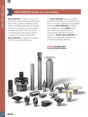 204 ISCAR CENTER DRILLING %u00bd%u0009MULTI-MASTER Solution for Center DrillingMULTI-MASTER is a family of tools with shanks and unique interchangeable heads for a variety of drilling, threading, milling, slitting, and slotting applications. Indexing is fast and convenient due to the unique threaded connection. Since the tool is not removed from the machine, there is no setup time for head replacement. MULTI-MASTER is a high-tech substitute for HSS and solid carbide tools. The MULTI-MASTER system guarantees excellent repeatability, and resharpening of tools is no longer needed. Interchangeable heads with MULTI-MASTER connection are available in various ISCAR grades that enable high speed machining with excellent toughness and wear resistance. ISCAR%u2019s MULTI-MASTER can reduce your production costs through increased production efficiency.40,000 Indexable Solid Carbide Endmill Options