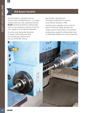 218 ISCAR DEEP HOLE DRILLING %u00bd%u0009ELB System GundrillsThe ELB system, originated from the German name %u201cEinlippenbohrer%u201d, is a single, straight fluted drill, also called the Gundrill. ISCAR provides Gundrills for drilling holes with an inner diameter of 0.9 mm to 40 mm and a depth of up to 440 drill diameters.Gundrills came along with advances in weapon technology and were first scientifically researched at the end of the 18th century. Earl Rumford, aka Benjamin Thompson, published his research at the Munich Arsenal in 1798.Gundrills were originally used to drill the barrel of firearms. Today, gundrills are widely used in all branches of mechanical engineering, usually for drilling deep holes on dedicated machines for mass production.