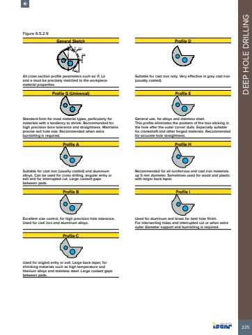 225DEEP HOLE DRILLINGFigure 6.5.2.9General Sketch Profile DLa%u00d8D%u03b1PAll cross section profile parameters such as: P, La and a must be precisely matched to the workpiece material properties.Suitable for cast iron only. Very effective in grey cast iron (usually coated).Profile G (Universal) Profile EStandard form for most material types, particularly for materials with a tendency to shrink. Recommended for high precision bore tolerance and straightness. Maintains precise exit hole size. Recommended when extra burnishing is required.General use, for alloys and stainless steel. This profile eliminates the problem of the tool sticking in the hole after the outer corner dulls. Especially suitable for crankshaft and other forged materials. Recommended for accurate hole straightness.Profile A Profile HSuitable for cast iron (usually coated) and aluminum alloys. Can be used for cross drilling, angular entry or exit and for interrupted cut. Large coolant gaps between pads.Recommended for all nonferrous and cast iron materials up 5 mm diameter. Sometimes used for wood and plastic with larger back taper.Profile B Profile IExcellent size control, for high precision hole tolerance. Used for cast iron and aluminum alloys.Used for aluminum and brass for best hole finish. For intersecting holes and interrupted cut or when extra outer diameter support and burnishing is required.Profile CUsed for angled entry or exit. Large back taper, for shrinking materials such as high temperature and titanium alloys and stainless steel. Large coolant gaps between pads.
