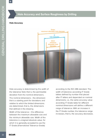 22 ISCAR GENERAL DRILLING HANDBOOK %u00bd%u0009Hole Accuracy and Surface Roughness by DrillingHole AccuracyDmaxmaximum allowable hole diameterDhole diameterDminminimum allowable hole diameterHole accuracy is determined by the width of the tolerance field, that is, the permissible deviation from the nominal dimensions.The nominal dimensions - the dimension that is a starting point for deviations and relative to which the limited dimensions are determined, that is, the dimensions that defined in the drawing.Width of the tolerance %u2013 the difference between the maximum allowable size and the minimum allowable size. Width of the tolerance is unsigned absolute value, for which it is generally accepted to use the IT Grade (International Tolerance Grade) according to the ISO 286 standard. The width of tolerance according IT Grade tables defined by number that placed after IT letters and depended on nominal dimensions, i.e., the same accuracy value according IT Grade table for different nominal dimensions will define a different range of tolerance. With an increase in the IT Grade number, the tolerance range increases, that is, the accuracy decreases.