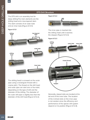 238 ISCAR DEEP HOLE DRILLINGDTS Drill StructureThe DTS drill is an assembly tool for deep drilling.The main elements are the drilling head and a two-layered stem. The stem consists of an outer tube and an inner tube (Figure 6.7.2.1).Figure 6.7.2.1drilling headtwo-layered stemdrilling headouter tubeinner tubeThe drilling head is screwed on the outer pipe using a rectangular thread with a coarse pitch. The thread on the drill head and outer pipe can start one or four-start, depending on the type of drill and the diameter of the drilling. The diameter of the outer drill pipe is slightly less than the diameter of the drill head (Figure 6.7.2.2).Figure 6.7.2.2DgapThe inner pipe is inserted into the drilling head until it reaches the stopper (Figure 6.7.2.3).Figure 6.7.2.3drilling headstopper4-start threadouter tube inner tubeGenerally, sloped slots are located at the tail end of the inner tube. The location of the inclined slots on the inner pipe is not random since the efficiency and performance of the ejector drill system depend on its position (Figure 6.7.2.4).