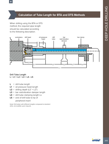 243DEEP HOLE DRILLING%u00bd%u0009Calculation of Tube Length for BTA and DTS MethodsWhen drilling using the BTA or DTS method, the required pipe length should be calculated according to the following description.Drill Tube LengthL = L1 + L2 + L3 + L4 - L5L = drill tube length L1 = oil pressure head lengthL2 = drilling depth (L2%u2019 + L2%u201d)L3 = bar rest/vibration damper lengthL4 = drill tube clamping length LsL5 = end of drill tube to tip of peripheral insertNote: Drill tubes with different lengths compared to standard drills, are availble upon request.workpiece drill headL5L1 L2%u2019 L2%u201d L4L1L3drill tubebar rest/vibration damperoil pressure bar clamphead