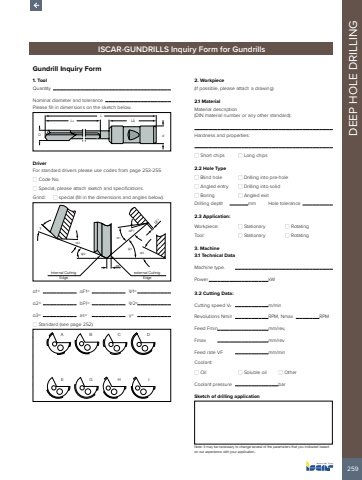 259DEEP HOLE DRILLINGISCAR-GUNDRILLS Inquiry Form for GundrillsGundrill Inquiry Form 1. ToolQuantityNominal diameter and tolerancePlease fill in dimensions on the sketch below.LLs LAD dDriverFor standard drivers please use codes from page 253-255o Code No.o Special, please attach sketch and specifications.Grind: o special (fill in the dimensions and angles below).as%u03b3%u03b12%u03c82%u03b11%u03b13bF1%u03b1F1%u03c81external CuttnigEdgeInternal CuttnigEdge%u03b11= %u03b1F1= %u03a81=%u03b12= bF1= %u03a82=%u03b13= as= %u03b3=o Standard (see page 252)Coating:o TiN o TiCN o TiN+TiCN o Othero IC208 (TiN) o IC308 (TiCN) o IC508 (TiCN+TiN)o IC908 (TiAlN) o TiAINType:Please circle the required type. See page 300.A B C DE G H I2. Workpiece(If possible, please attach a drawing)2.1 MaterialMaterial description (DIN material number or any other standard):Hardness and properties:o Short chips o Long chips2.2 Hole Typeo Blind hole o Drilling into pre-holeo Angled entry o Drilling into solido Boring o Angled exitDrilling depth mm Hole tolerance2.3 Application:Workpiece: o Stationary o RotatingTool: o Stationary o Rotating3. Machine3.1 Technical DataMachine type.Power kW3.2 Cutting Data:Cutting speed Vc m/minRevolutions Nmin RPM, Nmax RPMFeed Fmin mm/rev,Fmax mm/revFeed rate VF mm/minCoolant:o Oil o Soluble oil o OtherCoolant pressure barSketch of drilling applicationNote: It may be necessary to change several of the parameters that you indicated based on our experience with your application.