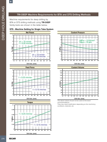 276 ISCAR DEEP HOLE DRILLINGTRI-DEEP Machine Requirements for BTA and DTS Drilling MethodsMachine requirements for deep drilling byBTA or DTS drilling methods using TRI-DEEPfamily tools are shown in the table below.STS - Machine Setting for Single Tube SystemNet PowerPc (kW)16 17 18 19 20 21 22 23 24 25 26 27 28876543210Vc = 75 m/minf = 0.25 mm/revVc = 75 m/minf = 0.15 mm/revDrill dia. (mm)Feed ForceFf (kN)16 17 18 19 20 21 22 23 24 25 26 27 28876543210f = 0.25 mm/revf = 0.15 mm/revDrill dia. (mm)TorqueT (kNm)16 17 18 19 20 21 22 23 24 25 26 27 280.10.080.060.040.020f = 0.25 mm/revf = 0.15 mm/revDrill dia. (mm)Coolant PressureP (MPa)16 17 18 19 20 21 22 23 24 25 26 27 281098765432101MPa = 1.0 N/mm21Mpa %u2248 10 atmDrill dia. (mm)Coolant Volumeq (l/min)16 17 18 19 20 21 22 23 24 25 26 27 28200180160140120100806040200Drill dia. (mm)The above values should not be used as the exact recommendations. They may need modification depending on the machining conditions, materials, etc.