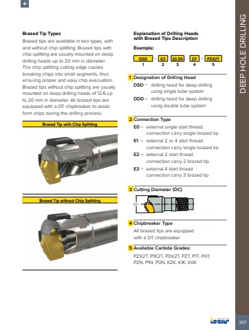297DEEP HOLE DRILLINGBrazed Tip TypesBrazed tips are available in two types, with and without chip splitting. Brazed tips with chip splitting are usually mounted on deep drilling heads up to 20 mm in diameter. The chip splitting cutting edge causes breaking chips into small segments, thus ensuring proper and easy chip evacuation. Brazed tips without chip splitting are usually mounted on deep drilling heads of 12.6 up to 20 mm in diameter. All brazed tips are equipped with a DT chipbreaker to assist form chips during the drilling process.Brazed Tip with Chip SplittingBrazed Tip without Chip SplittingExplanation of Drilling Headswith Brazed Tips DescriptionExample:DSD %u2013 E3 23.55 DT %u2013 PZX2T1 2 3 4 51 Designation of Drilling HeadDSD %u2013 drilling head for deep drilling using single tube systemDDD %u2013 drilling head for deep drilling using double tube system2 Connection TypeE0 %u2013 external single start thread connection carry single brazed tip E1 %u2013 external 2 or 4 start thread connection carry single brazed tipE2 %u2013 external 2 start thread connection carry 2 brazed tipE3 %u2013 external 4 start thread connection carry 3 brazed tip3 Cutting Diameter (DC)DC 4 Chipbreaker TypeAll brazed tips are equipped with a DT chipbreaker5 Available Carbide Grades: PZX2T, P1X2T, P0X2T, PZT, P1T, P0T, PZN, P1N, P0N, KZK, K1K, K0K