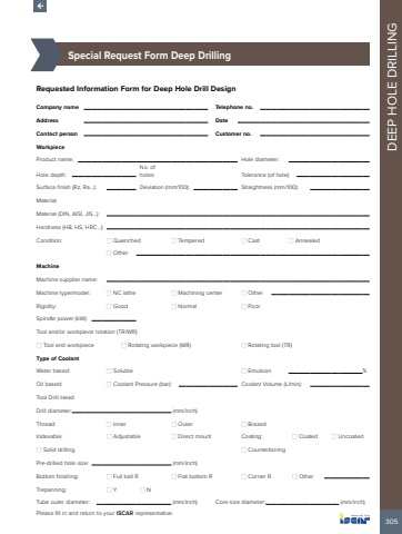 305DEEP HOLE DRILLING%u00bd%u0009Special Request Form Deep DrillingRequested Information Form for Deep Hole Drill Design Company name Telephone no.Address DateContact person Customer no.WorkpieceProduct name: Hole diameter:Hole depth:No. of holes: Tolerance (of hole):Surface finish (Rz, Ra...): Deviation (mm/100): Straightness (mm/100):MaterialMaterial (DIN, AISI, JIS...):Hardness (HB, HS, HRC...):Condition: o Quenched o Tempered o Cast o Annealedo OtherMachineMachine supplier name:Machine type/model: o NC lathe o Machining center o OtherRigidity: o Good o Normal o PoorSpindle power (kW):Tool and/or workpiece rotation (TR/WR): o Tool and workpiece o Rotating workpiece (WR) o Rotating tool (TR)Type of CoolantWater based: o Soluble o Emulsion %Oil based: o Coolant Pressure (bar): Coolant Volume (L/min):Tool Drill HeadDrill diameter: (mm/inch)Thread: o Inner o Outer o BrazedIndexable: o Adjustable o Direct mount Coating: o Coated o Uncoatedo Solid drilling o Counterboring Pre-drilled hole size: (mm/inch)Bottom finishing: o Full ball R o Flat bottom R o Corner R o OtherTrepanning: o Y o NTube outer diameter: (mm/inch) Core size diameter: (mm/inch)Please fill in and return to your ISCAR representative.