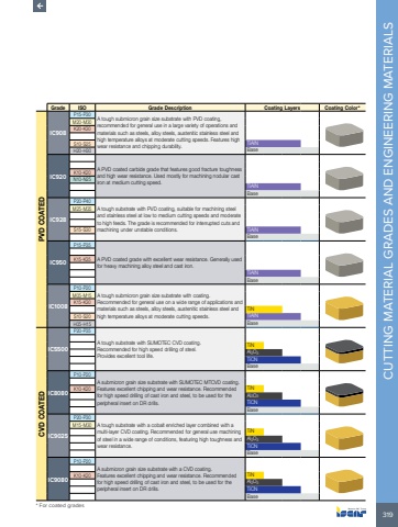 319CUTTING MATERIAL GRADES AND ENGINEERING MATERIALSGrade ISO Grade Description Coating Layers Coating Color*PVD COATEDIC908P15-P30A tough submicron grain size substrate with PVD coating, recommended for general use in a large variety of operations and materials such as steels, alloy steels, austenitic stainless steel and high temperature alloys at moderate cutting speeds. Features high wear resistance and chipping durability.M20-M30K20-K30S10-S25 TiAlNH20-H30 BaseIC920A PVD coated carbide grade that features good fracture toughness and high wear resistance. Used mostly for machining nodular cast iron at medium cutting speed.K10-K20N10-N25TiAlNBaseIC928P20-P40A tough substrate with PVD coating, suitable for machining steel and stainless steel at low to medium cutting speeds and moderate to high feeds. The grade is recommended for interrupted cuts and machining under unstable conditions.M25-M35S15-S30 TiAlNBaseIC950P15-P35A PVD coated grade with excellent wear resistance. Generally used for heavy machining alloy steel and cast iron.K15-K35TiAlNBaseIC1008P10-P20A tough submicron grain size substrate with coating. Recommended for general use on a wide range of applications and materials such as steels, alloy steels, austenitic stainless steel and high temperature alloys at moderate cutting speeds.M05-M15K15-K30TiNS10-S20 TiAlNH05-H15 BaseCVD COATEDIC5500P20-P35A tough substrate with SUMOTEC CVD coating. Recommended for high speed drilling of steel. Provides excellent tool life.TiNAl2O3TiCNBaseIC8080P10-P20A submicron grain size substrate with SUMOTEC MTCVD coating. Features excellent chipping and wear resistance. Recommended for high speed drilling of cast iron and steel, to be used for the peripheral insert on DR drills.K10-K20 TiNAl2O3TiCNBaseIC9025P20-P30A tough substrate with a cobalt enriched layer combined with a multi-layer CVD coating. Recommended for general use machining of steel in a wide range of conditions, featuring high toughness and wear resistance.M15-M30TiNAl2O3TiCNBaseIC9080P10-P20A submicron grain size substrate with a CVD coating. Features excellent chipping and wear resistance. Recommended for high speed drilling of cast iron and steel, to be used for the peripheral insert on DR drills.K10-K20 TiNAl2O3TiCNBase* For coated grades