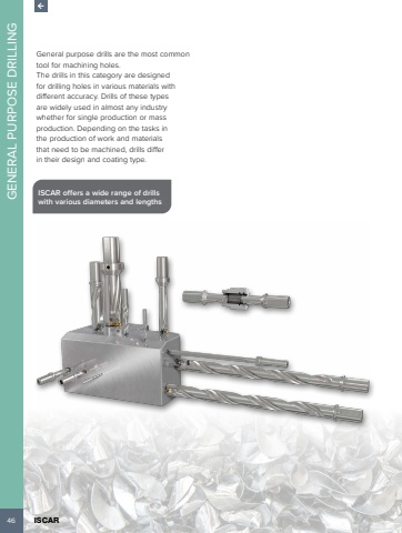 46 ISCAR GENERAL PURPOSE DRILLINGGeneral purpose drills are the most common tool for machining holes. The drills in this category are designed for drilling holes in various materials with different accuracy. Drills of these types are widely used in almost any industry whether for single production or mass production. Depending on the tasks in the production of work and materials that need to be machined, drills differ in their design and coating type.ISCAR offers a wide range of drills with various diameters and lengths