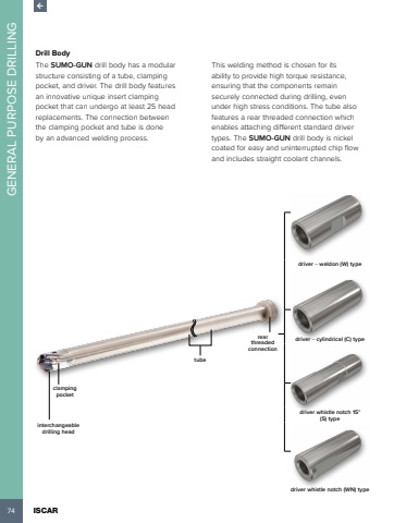 74 ISCAR GENERAL PURPOSE DRILLINGDrill BodyThe SUMO-GUN drill body has a modular structure consisting of a tube, clamping pocket, and driver. The drill body features an innovative unique insert clamping pocket that can undergo at least 25 head replacements. The connection between the clamping pocket and tube is done by an advanced welding process. This welding method is chosen for its ability to provide high torque resistance, ensuring that the components remain securely connected during drilling, even under high stress conditions. The tube also features a rear threaded connection which enables attaching different standard driver types. The SUMO-GUN drill body is nickel coated for easy and uninterrupted chip flow and includes straight coolant channels. interchangeable drilling headclamping pockettuberear threaded connectiondriver %u2013 weldon (W) typedriver %u2013 cylindrical (C) typedriver whistle notch 15%u00b0 (S) typedriver whistle notch (WN) type