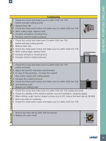 93GENERAL PURPOSE DRILLINGTroubleshootingBuilt-Up Edge1 Check the runout and make sure it is within 0.02 mm T.I.R. (radial and axial cutting points).2 Reduce feed rate.3 Check the chisel point runout and make sure it is within 0.02 mm T.I.R.4 Worn cutting edge. replace head.5 Increase workpiece chucking force.6 Increase internal coolant pressure. Deviation of Hole Tolerance1 Check the runout and make sure it is within 0.02 mm T.I.R. (radial and axial cutting points).2 Reduce feed rate.3 Check the chisel point runout and make sure it is within 0.02 mm T.I.R.4 Worn cutting edge. replace head.5 Increase workpiece chucking force.6 Increase internal coolant pressure.%u00d8 > D nominal + 0.15mm%u00d8 < D nominal - 0.03mmD nominalSurface Finish Too Rough1 Check the runout and make sure it is within 0.02 mm T.I.R. (radial and axial).2 Adjust the feed for improved chip formation.3 In case of chip jamming - increase the coolant flow and/or reduce the cutting speed.4 Increase the coolant pressure.5 Check the chisel point runout and make sure it is within 0.02 mm T.I.R.6 Use pecking cycle.7 Replace the drilling headRaInaccurate Hole Position1 Check the runout and make sure it is within 0.02 mm T.I.R. (radial and axial).2 Check the stability of the machine spindle, tool and workpiece clamping rigidity.3 When drilling rough, hard or sloped surfaces (up to 12%u00b0), reduce the feed rate by 30-50% 4 Drill a pre-hole for centering.5 Check the chisel point runout and make sure it is within 0.02 mm T.I.R.Burrs on Exit1 Reduce the feed rate by 50%-70% during exit.2 Replace the worn head.