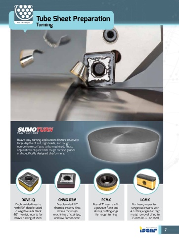 Double-sided inserts        Double-sided 80°        Round 7° inserts with      For heavy super turn