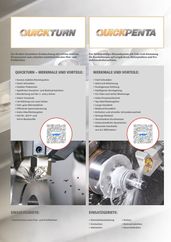 Das flexibel einsetzbare Drehwerkzeug mit extrem stabilem Klemmsystem zum schnellen multidirektionalen Plan- und Profildrehen.EINSATZGEBIETE:%u2022 Multidirektionales Plan- und ProfildrehenQUICKTURN %u2013 MERKMALE UND VORTEILE:%u2022 Extrem stabiles Klemmsystem%u2022 Sechs Schneiden%u2022 Stabiler Plattensitz %u2022 Spielfreies Vorw%u00e4rts- und R%u00fcckw%u00e4rtsdrehen%u2022 Bearbeitung auf der x- und y-Achse%u2022 Hoher Vorschub%u2022 Jet-K%u00fchlung von zwei Seiten%u2022 Sehr gute W%u00e4rmeabfuhr%u2022 Effiziente Spanevakuierung%u2022 Hohe Oberfl%u00e4cheng%u00fcten%u2022 ISO-M-, ISO-P- und ISO-K-WerkstoffeEINSATZGEBIETE:%u2022 Kleinteilebearbeitung%u2022 Einstechen%u2022 AbstechenMERKMALE UND VORTEILE:%u2022 F%u00fcnf Schneiden%u2022 Safe-Lock-Klemmung%u2022 Punktgenaue K%u00fchlung%u2022 Intelligente Verriegelung%u2022 F%u00fcr linke und rechte Werkzeuge%u2022 Hohe Prozesssicherheit%u2022 Top Oberfl%u00e4cheng%u00fcten%u2022 Lange Standzeit %u2022 Bedienerfreundlich %u2022 Einfacher und schneller Schneidenwechsel %u2022 Geringe R%u00fcstzeit %u2022 Verschiedene Durchmesser %u2022 Unterschiedliche Geometrien%u2022 Maximale Stechtiefe von 6,2 MillimeternDas f%u00fcnfschneidige Allroundsystem mit Safe-Lock-Klemmung f%u00fcr Bearbeitungen auf Langdrehern, Mehrspindlern und Produktionsdrehmaschinen. %u2022 Drehen%u2022 R%u00fcckw%u00e4rtsdrehen%u2022 Gewindedrehen