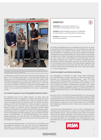 Die Werkzeuge werden mit einer HSK-T-40-Schnittstelle angeboten. Die Norm T (f%u00fcr Turning) verf%u00fcgt %u00fcber ein reduziertes Spiel zwischen der Mitnehmernut des Werkzeughalters und dem Keil der Spindel. Diese Spielbegrenzung sorgt f%u00fcr eine h%u00f6here Genauigkeit bei der Positionierung der Schneidkante des Drehwerkzeugs. Sie sind auch in HSK-A 40 und Capto C4 erh%u00e4ltlich. ISCAR kann zudem HSK-T Werkzeughalter f%u00fcr andere Dreh- wie auch Fr%u00e4soperationen liefern. Alle diese Werkzeuge k%u00f6nnen auf die spezifischen Bed%u00fcrfnisse des Kunden zugeschnitten werden.Ein sensibler Vorgang, der eine leistungsf%u00e4hige K%u00fchlung erfordertDas Abstechen kann sich als heikel erweisen, vor allem, wenn die Schnitttiefe gro%u00df wird. Im Gegensatz zu anderen Drehprozessen taucht das Werkzeug radial in das Material ein, sodass nur die Nut als Fluchtweg f%u00fcr die Sp%u00e4ne bleibt. Dies bestimmt auch ihre Gr%u00f6%u00dfe, die immer analog zur Breite der Schneidplatte ist. Wenn die Sp%u00e4ne zu hei%u00df werden, dehnen sie sich so weit aus, dass sie sich in der Nut verklemmen.Dadurch entsteht ein Pfropfen, der den Abtransport weiterer Sp%u00e4ne verhindert und die Zufuhr von K%u00fchlschmierstoff st%u00f6rt. Reibung und Hitzeentwicklung f%u00fchren schlie%u00dflich zum Bruch der Wendeschneidplatte und zur Besch%u00e4digung der Werkzeugklinge. Um einen stabilen Schneidprozess zu gew%u00e4hrleisten, ist das Sp%u00e4ne-Management von entscheidender Bedeutung. Dies wird durch eine f%u00fcr das Material optimierte Spanbrecher-Geometrie, aber auch durch eine Schmierung nahe an der Schneidkante sichergestellt.Die Hochdruck-K%u00fchlmittelzufuhr ist die Garantie f%u00fcr zuverl%u00e4ssiges und leistungsstarkes Abstechen. Dies gilt umso mehr bei langspanenden, Materialien mit schlechter Zerspanbarkeit wie Reintitan. Um eine optimale K%u00fchlung und Schmierung der Schneidkante zu gew%u00e4hrleisten, SHORTCUTAUFGABE: Automatisches Abstechen von 70-Millimeter-Titanstangen aus dem VollenL%u00d6SUNG: MODULARGRIP-Abstechkit mit TANGPADSchneidenhaltern und TANG-GRIP-Schneideins%u00e4tzen NUTZEN: Prozesssicherer und wirtschaftlicher automatischer Prozessihat ISCAR seine Werkzeuge mit zwei Kan%u00e4len f%u00fcr die Zufuhr von Hochdruck-K%u00fchlschmierstoff ausgestattet. Der erste befindet sich oberhalb des Werkzeuges und richtet den Strahl direkt auf die Schneide. Der zweite befindet sich unterhalb und zielt auf die Freifl%u00e4che der Wendeschneidplatte. Bei einem Betriebsdruck von bis zu 340 bar ist die Abfuhr von Sp%u00e4nen kein Problem. Die Ergebnisse, die Bumotec beim Abstechen von Titan erzielt, sind so %u00fcberzeugend, dass das Werkzeug auch f%u00fcrs Schruppen eingesetzt wird. %u201eWenn eine radiale Schruppstrategie f%u00fcr den hinteren Teil eines Werkst%u00fccks sinnvoll ist, kann sie f%u00fcr den vorderen Teil weniger sinnvoll erscheinen. Wir haben jedoch festgestellt, dass in dieser Konfiguration die Kontrolle %u00fcber den Span dank der ausgezeichneten Steuerung der K%u00fchlmittelzufuhr unter hohem Druck besser ist%u201c, erkl%u00e4rt Philippe Morel.Gro%u00dfe Vielseitigkeit und einfache BeschaffungDie Vielseitigkeit ist ebenfalls ein gro%u00dfer Vorteil dieser Werkzeuge.Die Abstechl%u00f6sungen verf%u00fcgen %u00fcber die von ISCAR bevorzugte Konfiguration mit austauschbaren Schneideins%u00e4tzen. %u201eWenn ein Kunde nicht in mehrere Werkzeughalter investieren m%u00f6chte, kann er nur die Abstechklinge austauschen, um alle Durchmesser und Breiten zu nutzen, die derzeit mit diesem Produktportfolio verf%u00fcgbar sind%u201c, erkl%u00e4rt Pierre-Andr%u00e9 Brulhart. Die Klingen wurden auf Basis von Standardprodukten aus der MODULARGRIP-Produktlinie von ISCAR entwickelt. Die TAGPAD-Plattenhalter lassen sich mit TANG-GRIP-Schneideins%u00e4tzen best%u00fccken.Dank der mehr als 130 ISCAR-Tochtergesellschaften und -Vertretungen in rund 60 L%u00e4ndern ist die Beschaffung von Wendeschneidplatten (WSP) und Ersatzteilen einfach. In der Schweiz k%u00f6nnen die Kunden direkt %u00fcber ISCAR Hartmetall oder einen der H%u00e4ndler wie SFS und Br%u00fctsch R%u00fcegger Tools bestellen. Es gibt auch einen Online-E-Shop, der es erm%u00f6glicht, die Produkte des Herstellers schnell zu finden und zu bestellen, und das alles portofrei.%u201eWir bieten diese Werkzeughalter in Kits mit einer vollst%u00e4ndigen Nomenklatur aller Komponenten an, sodass wir bei Bedarf leicht ein Produkt empfehlen k%u00f6nnen. Was die Artikelnummern dieser Kits betrifft, sind sie immer doppelt vorhanden, mit der Bezeichnung von Bumotec und ISCAR. Wir bieten diese Werkzeuge als Grundausstattung f%u00fcr unsere neuen Maschinen an und verf%u00fcgen %u00fcber einen Bestand an Kundenhilfsmitteln, der nicht mit ISCAR konkurriert%u201c, schlie%u00dft Pierre-Andr%u00e9 Brulhart.Arbeiten vertrauensvoll zusammen (v.l.): Anwendungstechniker Jean Hattenberger, Ren%u00e9 Missillier, Vertriebsmitarbeiter S%u00fcd-Romandie, beide ISCAR, und Stephan Narnhofer, Applikationsingenieur bei Starrag Bumotec.63