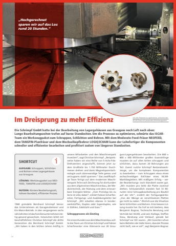Im Dreisprung zu mehr EffizienzDie Schrimpf GmbH hatte bei der Bearbeitung von Lagergeh%u00e4usen aus Grauguss noch Luft nach oben: Lange Bearbeitungszeiten trafen auf kurze Standzeiten. Um die Prozesse zu optimieren, schn%u00fcrte das ISCARTeam ein Werkzeugpaket zum Schruppen, Schlichten und Bohren. Mit dem Moderate-Feed-Fr%u00e4ser NEOFEED, dem TANGFIN-Planfr%u00e4ser und dem Wechselkopfbohrer LOGIQ3CHAM kann der Lohnfertiger die Komponenten schneller und effizienter bearbeiten und profitiert zudem von l%u00e4ngeren Standzeiten.1960 gr%u00fcndete Bernhard Schrimpf Senior das Unternehmen als Garagendreherei und Ein-Mann-Betrieb. In den vergangenen sechs Jahrzehnten ist das Familienunternehmen stetig gesund gewachsen. Inzwischen leitet mit Gesch%u00e4ftsf%u00fchrer Christian Schrimpf die dritte Generation die Bernhard Schrimpf GmbH.%u201eWir haben in den letzten Jahren kr%u00e4ftig in unsere Mitarbeiter und den Maschinenpark investiert%u201c, sagt Christian Schrimpf. %u201eBeispielsweise haben wir eine Reihe von 5-Achs-Fr%u00e4sDrehzentren angeschafft, k%u00f6nnen jetzt zudem Gro%u00dfteile bis 1.750 Millimeter Durchmesser drehen und dank Magnetspanntechnologie auch d%u00fcnnwandige Teile genau und verzugsarm stabil spannen.%u201c Das zw%u00f6lfk%u00f6pfige Team fertigt auf dem modernen Maschinenpark Teile nach Zeichnung f%u00fcr die Kunden aus dem allgemeinen Maschinenbau, der Medizintechnik, der R%u00fcstung und dem erneuerbare Energien-Sektor. %u201eVom Prototyp bis zu Serie ist alles dabei%u201c, erkl%u00e4rt Fabian Scharfenecker, Fertigungs- und Ausbildungsleiter bei Schrimpf. %u201eWir arbeiten ebenso in Sonderwerkstoffen, Duplex oder Superduplex, wie in St%u00e4hlen, Edelstahl und Guss.%u201c Schruppprozess als EinstiegF%u00fcr einen Kunden aus dem Maschinenbau sollte das Team um Christian Schrimpf und Fabian Scharfenecker eine Kleinserie aus 20 Grau-%u201eHochgerechnet sparen wir auf das Los rund 20 Stunden.%u201cSHORTCUTAUFGABE: Schruppen, Schlichten und Bohren eines Lagergeh%u00e4uses aus Grauguss L%u00d6SUNG: Werkzeugpaket aus NEOFEED, TANGFIN und LOGIQ3CHAM NUTZEN: K%u00fcrzere Bearbeitungszeit, h%u00f6here Standzeit, effizienter Prozessiguss-Lagergeh%u00e4usen bearbeiten. Die 800 %u00d7 800 %u00d7 400 Millimeter gro%u00dfen Gussrohlinge mussten sie auf allen Seiten schruppen und schlichten, dazu kamen 20 Bohrungen pro Teil. Zuerst nutzte Schrimpf Bestandswerkzeuge, um die komplexen Komponenten zu bearbeiten %u2013 zum Schruppen etwa einen sechsschneidigen Eckfr%u00e4ser eines ISCARMarktbegleiters. Mit m%u00e4%u00dfigem Erfolg %u2013 weder Bearbeitungs- noch Standzeit waren gut.%u201eWir mussten pro Seite die Platte zweimal drehen. Schlussendlich standen fast 72 Minuten reine Schruppbearbeitung pro Bauteil auf der Uhr%u201c, erz%u00e4hlt der Fertigungsleiter.%u201eVon der Menge an verschlissenen Platten gar nicht zu reden.%u201c %u00c4hnlich war die Situation beim Schlichten und Bohren. Eine bessere L%u00f6sung musste her. Da traf es sich bestens, dass Benjamin Bognar, Technische Beratung und Vertrieb bei ISCAR, und sein Kollege, Steffen Grau, Beratung und Verkauf, gerade bei Schrimpf vor Ort waren. %u201eWir konnten schon beim Betreten der Halle h%u00f6ren, dass der Prozess nicht l%u00e4uft, wie er soll%u201c, sagt Benjamin Bognar.Um die Prozesse zu optimieren, schn%u00fcrte das ISCAR-Team ein passendes Werkzeugpaket.14