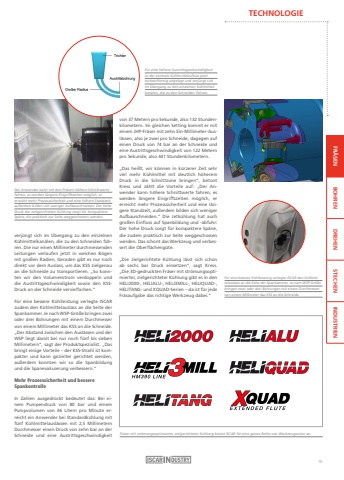 TECHNOLOGIEFR%u00c4SEN BOHREN DREHEN STECHEN INDUSTRIENverj%u00fcngt sich im %u00dcbergang zu den einzelnen K%u00fchlmittelkan%u00e4len, die zu den Schneiden f%u00fchren. Die nur einen Millimeter durchmessenden Leitungen verlaufen jetzt in weichen B%u00f6gen mit gro%u00dfen Radien, Geraden gibt es nur noch direkt vor dem Auslass, um das KSS zielgenau an die Schneide zu transportieren. %u201eSo konnten wir den Volumenstrom verdoppeln und die Austrittsgeschwindigkeit sowie den KSSDruck an der Schneide vervielfachen.%u201c F%u00fcr eine bessere K%u00fchlleistung verlegte ISCAR zudem den K%u00fchlmittelauslass an die Seite der Spankammer. Je nach WSP-Gr%u00f6%u00dfe bringen zwei oder drei Bohrungen mit einem Durchmesser von einem Millimeter das KSS an die Schneide.%u201eDer Abstand zwischen den Ausl%u00e4ssen und der WSP liegt damit bei nur noch f%u00fcnf bis sieben Millimetern%u201c, sagt der Produktspezialist. %u201eDas bringt einige Vorteile %u2013 der KSS-Strahl ist kompakter und kann gezielter gerichtet werden, au%u00dferdem konnten wir so die Spanbildung und die Spanevakuierung verbessern.%u201c Mehr Prozesssicherheit und bessere SpankontrolleIn Zahlen ausgedr%u00fcckt bedeutet das: Bei einem Pumpendruck von 80 bar und einem Pumpvolumen von 46 Litern pro Minute erreicht ein Anwender bei Standardk%u00fchlung mit f%u00fcnf K%u00fchlmittelausl%u00e4ssen mit 2,5 Millimetern Durchmesser einen Druck von zehn bar an der Schneide und eine Austrittsgeschwindigkeit Der Anwender kann mit den Fr%u00e4sern h%u00f6here Schnittwerte fahren, es werden l%u00e4ngere Eingriffszeiten m%u00f6glich, er erreicht mehr Prozesssicherheit und eine h%u00f6here Standzeit, au%u00dferdem bilden sich weniger Aufbauschneiden. Der hohe Druck der zielgerichteten K%u00fchlung sorgt f%u00fcr kompaktere Sp%u00e4ne, die praktisch zur Seite weggeschossen werden. F%u00fcr eine bessere K%u00fchlleistung verlegte ISCAR den K%u00fchlmittelauslass an die Seite der Spankammer. Je nach WSP-Gr%u00f6%u00dfebringen zwei oder drei Bohrungen mit einem Durchmesservon einem Millimeter das KSS an die Schneide.F%u00fcr eine h%u00f6here Austrittsgeschwindigkeit ist der zentrale K%u00fchlmittelzufluss jetzt trichterf%u00f6rmig angelegt und verj%u00fcngt sich im %u00dcbergang zu den einzelnen K%u00fchlmittelkan%u00e4len, die zu den Schneiden f%u00fchren.von 37 Metern pro Sekunde, also 132 Stundenkilometern. Im gleichen Setting kommt er mit einem JHP-Fr%u00e4ser mit zehn Ein-Millimeter-Ausl%u00e4ssen, also je zwei pro Schneide, dagegen auf einen Druck von 74 bar an der Schneide und eine Austrittsgeschwindigkeit von 122 Metern pro Sekunde, also 441 Stundenkilometern.%u201eDas hei%u00dft, wir k%u00f6nnen in k%u00fcrzerer Zeit sehr viel mehr K%u00fchlmittel mit deutlich h%u00f6herem Druck in die Schnittzone bringen%u201c, betont Kress und z%u00e4hlt die Vorteile auf: %u201eDer Anwender kann h%u00f6here Schnittwerte fahren, es werden l%u00e4ngere Eingriffszeiten m%u00f6glich, er erreicht mehr Prozesssicherheit und eine l%u00e4ngere Standzeit, au%u00dferdem bilden sich weniger Aufbauschneiden.%u201c Die Jetk%u00fchlung hat auch gro%u00dfen Einfluss auf Spanbildung und -abfuhr: Der hohe Druck sorgt f%u00fcr kompaktere Sp%u00e4ne, die zudem praktisch zur Seite weggeschossen werden. Das schont das Werkzeug und verbessert die Oberfl%u00e4cheng%u00fcte. %u201eDie zielgerichtete K%u00fchlung l%u00e4sst sich schon ab sechs bar Druck einsetzen%u201c, sagt Kress.%u201eDie 3D-gedruckten Fr%u00e4ser mit str%u00f6mungsoptimierter, zielgerichteter K%u00fchlung gibt es in den HELI2000-, HELIALU-, HELI3MILL-, HELIQUAD-, HELITANG- und XQUAD-Serien %u2013 da ist f%u00fcr jede Fr%u00e4saufgabe das richtige Werkzeug dabei.%u201cFr%u00e4ser mit str%u00f6mungsoptimierter, zielgerichteter K%u00fchlung bietet ISCAR f%u00fcr eine ganze Reihe von Werkzeugserien an.19