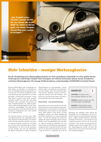 Mehr Schneiden %u2013 weniger WerkzeugkostenBei der Bearbeitung eines d%u00fcnnwandigen Bauteils aus Titan stand Mayer Feintechnik vor einer gro%u00dfen Herausforderung: Der Lohnfertiger k%u00e4mpfte beim Schruppen mit schlecht brechenden Sp%u00e4nen, kurzen Standzeiten und hohen Werkzeugkosten. Die L%u00f6sung: ISCARs brandneue, sechsschneidige LOGIQ6TURN im Parallel-Einsatz. Miniatur M%u00f6bel Mayer, 1951 in G%u00f6ttingen vonWilly Mayer als Hersteller von Miniaturm%u00f6beln f%u00fcr Modelleisenbahnen gegr%u00fcndet, hat sich %u00fcber die Jahre durch konsequente Weiterentwicklung und Investitionen zu einem gefragten Lohnfertiger gemausert. Heute fr%u00e4st, dreht, montiert, misst, pr%u00fcft, veredelt, schwei%u00dft, schleift und hont das 130 K%u00f6pfe z%u00e4hlende Team als Mayer Feintechnik auf einer Produktionsfl%u00e4che von 6.000 Quadratmetern Teile und Baugruppen f%u00fcr seine internationalen Auftraggeber. Seit 2023 geh%u00f6rt das Unternehmen zur Andra Tech-Group und erzielte im vergangenen Jahr einen Umsatz von 17 Millionen Euro.Die Kunden kommen aus der Laser-, Messund Medizintechnik, der Halbleiterbranche, dem allgemeinen Maschinenbau, der Lebensmittel- und der optischen Industrie. Sie erwarten h%u00f6chste Qualit%u00e4t, Liefertreue und haben zum Teil sehr hohe Anforderungen in Sachen Teilesauberkeit. So bunt wie der Branchenmix der Kunden sind auch die Werkstoffe, die Mayer Feintechnik in seinem modernen Maschinenpark ver- und bearbeitet. %u201eHaupts%u00e4chlich haben wir Edelstahl und Aluminium auf den Anlagen, aber auch Kunststoff, Messing, Bronze, Hastelloy, Inconel und Titan%u201c, sagt Sven Aschoff, Leiter der Dreherei. %u201eWir setzen um, was der Kunde haben will und haben dabei keinerlei Ber%u00fchrungs%u00e4ngste.%u201c Neuer Kunde %u2013 neue HerausforderungEnde 2023 trat ein neuer Kunde aus der Medizintechnik mit einem Auftrag f%u00fcr d%u00fcnnwandige Bauteile in drei Varianten mit L%u00e4ngen bis 81 Millimetern an das Team um Sven Aschoff heran. Diese sollten in Titan Grad 5 (3.7165) ausgef%u00fchrt werden, mit dessen Bearbeitung das Mayer Feintechnik nur wenig Erfahrung hatte %u2013 und die Zeit dr%u00e4ngte: Der Kunde ben%u00f6tigte die ersten Prototypen bereits wenige Wochen nach Auftragseingang f%u00fcr eine Messe. %u201eBei der Fertigung durchliefen wir eine steile Lernkurve und erkannten viele Optimierungspotenziale%u201c, sagt Sven Aschoff. Die zeigten sich vor allem beim Schruppen der Kontur.%u201eTitan ist schwer zu zerspanen, da muss das Werkzeug viel aushalten. Dazu kommt die Schnitttiefe von 2,5 Millimetern, die sich zus%u00e4tzlich negativ auf die Standzeiten auswirken kann%u201c, erg%u00e4nzt Andreas Mielchen, Einrichter bei Mayer Feintechnik. %u201eAuch Spanbruch und -evakuierung waren nicht so, wie wir uns das vorstellten.%u201c Eine bessere L%u00f6sung musste her.Deshalb wandte sich das Mayer-Team an seinen Werkzeugpartner ISCAR, mit dem das Unternehmen schon seit fast 30 Jahren erfolgreich zusammenarbeitet.%u201eDas Projekt unterstreicht, warum ISCAR f%u00fcr uns immer die erste Wahl ist, wenn es darum geht, ein neues Produkt vern%u00fcnftig zum Laufen zu bringen.%u201c SHORTCUTAUFGABE: Schruppen eines d%u00fcnnwandigen Bauteils aus TitanL%u00d6SUNG: Paralleler Einsatz von zwei sechsschneidigen LOGIQ6TURN NUTZEN: Prozesssicherheit, guter Spanbruch, wirtschaftlicher Prozess i30