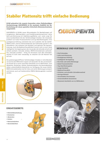 FR%u00c4SEN BOHREN DREHEN STECHEN INDUSTRIENNEWSEINSATZGEBIETE:%u2022 Kleinteilebearbeitung%u2022 Einstechen%u2022 Abstechen%u2022 Drehen%u2022 R%u00fcckw%u00e4rtsdrehen%u2022 GewindedrehenISCAR pr%u00e4sentiert die neueste Generation seines f%u00fcnfschneidigen Stechwerkzeugs: QUICKPENTA ist f%u00fcr maximale Stabilit%u00e4t bei der Bearbeitung mit einem speziellen Sicherheits-Klemmmechanismus ausgestattet.QUICKPENTA ist ISCARs neues Allroundsystem f%u00fcr Bearbeitungen auf Langdrehern, Mehrspindlern und Produktionsdrehmaschinen. Seine Safe-Lock-Klemmung mit Stabilisierungsfl%u00e4chen und -nuten sorgt f%u00fcr einen bombenfesten Sitz der f%u00fcnfschneidigen Eins%u00e4tze. Der Anwender profitiert von hoher Prozesssicherheit und top Oberfl%u00e4cheng%u00fcten. Eine punktgenaue K%u00fchlung unterst%u00fctzt das noch zus%u00e4tzlich. Bei der QUICKPENTA leiten interne K%u00fchlmittelkan%u00e4le das K%u00fchlmittel gezielt in die Schneidzone. Das verbessert die Standzeit und optimiert die Spanevakuierung. Auch die Bedienerfreundlichkeit kommt nicht zu kurz: Dank intelligenter Verriegelung kann der Anwender die Schneide schnell und einfach wechseln. Schraube anl%u00f6sen, PENTA-Schneideinsatz weiterdrehen, Schraube anziehen %u2013 fertig. Ein Einmessen nach dem Schneidenwechsel ist nicht mehr notwendig. So reduziert sich die R%u00fcstzeit fast auf null.Die pr%u00e4zisionsgeschliffenen f%u00fcnfschneidigen Eins%u00e4tze in Schnittbreiten von 0,5 bis drei Millimetern eignen sich besonders f%u00fcr den prozesssicheren Einsatz bis zu einer maximalen Stechtiefe von 6,2 Millimetern. Zum Abstechen, Einstechen, Drehen, R%u00fcckw%u00e4rtsdrehen und Gewindedrehen stehen unterschiedliche Geometrien zur Verf%u00fcgung. Die neuen QUICKPENTA-Schneideins%u00e4tze sind f%u00fcr linke und rechte Werkzeuge konzipiert und k%u00f6nnen auch auf herk%u00f6mmliche PENTA-Werkzeughalter montiert werden.Stabiler Plattensitz trifft einfache BedienungMERKMALE UND VORTEILE:%u2022 F%u00fcnf Schneiden%u2022 Safe-Lock-Klemmung%u2022 Punktgenaue K%u00fchlung%u2022 Intelligente Verriegelung%u2022 F%u00fcr linke und rechte Werkzeuge%u2022 Hohe Prozesssicherheit%u2022 Top Oberfl%u00e4cheng%u00fcten%u2022 Lange Standzeit %u2022 Bedienerfreundlich %u2022 Einfacher und schneller Schneidenwechsel %u2022 Geringe R%u00fcstzeit %u2022 Verschiedene Durchmesser %u2022 Unterschiedliche Geometrien%u2022 Maximale Stechtiefe von 6,2 Millimetern44