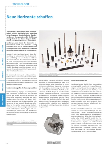 FR%u00c4SEN BOHREN DREHEN STECHEN INDUSTRIENTECHNOLOGIENeue Horizonte schaffenStandardwerkzeuge sind schnell verf%u00fcgbar, jedoch erf%u00fcllen sie h%u00e4ufig keine speziellen Anforderungen. Hocheffiziente Sonderwerkzeuge dagegen schon. Sie sind jedoch wenig flexibel und haben l%u00e4ngere Lieferzeiten. Eine Alternative sind Semistandardwerkzeuge, aus denen der Anwender relativ schnell selbst seine spezielle L%u00f6sung herstellen kann. ISCAR bietet neben diesen Rohlingen auch einen modularen Baukasten mit einer breiten Palette an Komponenten.Standard- oder Spezialwerkzeug? Diese Entscheidung ist oft essenziell f%u00fcr ein Unternehmen und h%u00e4ngt von verschiedenen Faktoren ab: unter anderem der Unternehmenssituation, vom Fertigungsprogramm und der Bearbeitungsmethode. Dazu kommen pers%u00f6nliche Pr%u00e4ferenzen. Eine effiziente M%u00f6glichkeit sind flexible Standard-Schneidwerkzeuge, mit denen der Anwender eine Vielzahl unterschiedlicher Teile herstellen kann.Sie bieten zudem sehr gute Leistungsmerkmale beim Zerspanen verschiedener Werkstoffe.F%u00fcr einen reibungslosen Prozess ist zudem eine schnelle Verf%u00fcgbarkeit entscheidend. Deshalb bilden Standardl%u00f6sungen in der Regel die Basis des Werkzeugbestands.Sonderwerkzeuge f%u00fcr die MassenproduktionSonderwerkzeuge dagegen sind ma%u00dfgeschneidert. Anwender k%u00f6nnen damit ein speziellesBauteil aus einem bestimmten Material aufeiner daf%u00fcr vorgesehen Maschine und Werkst%u00fcckaufnahme herstellen. Mit diesen Werkzeugen erreichen sie die bestm%u00f6gliche Leistung und f%u00fcr sie optimale Ergebnisse. Allerdings ist eine solche L%u00f6sung wenig flexibel %u2013denn auf andere Anwendungen lassen sie sich meist nicht anpassen. Damit eignen sich Sonderwerkzeuge insbesondere f%u00fcr die Massenproduktion %u2013 etwa f%u00fcr Gro%u00dfserien in der Automobilbranche.Wegen seiner speziellen Anpassung an eine Aufgabe, ist ein Sonderwerkzeug meist nicht sofort verf%u00fcgbar. Seine Herstellung ist mit erheblichem technischen Aufwand verbunden, wie Konzeption, Abstimmung mit dem Kunden und Detailkonstruktion. Deshalb ist die Lieferzeit deutlich l%u00e4nger als bei Standardl%u00f6sungen. Metallverarbeitende Unternehmen m%u00fcssen sich oft zwischen Standard- und Sonderwerkzeugen entscheiden. Wichtige Faktoren hierbei sind die Projektlaufzeit aber auch wirtschaftliche Faktoren wie St%u00fcck- und Werkzeugkosten. Eine m%u00f6glichst kurze Vorlaufzeit ist deshalb ein wichtiger Faktor bei der Werkzeugauswahl.Lieferzeiten verk%u00fcrzenSonderwerkzeuge sind in ihrer Konstruktion unterschiedlich komplex. In einigen F%u00e4llen gen%u00fcgt es schon, Standardwerkzeuge nur leicht zu modifizieren, beispielsweise die L%u00e4nge oder den Eckenradius zu %u00e4ndern. Dies f%u00e4llt dann unter die Kategorie Semistandard-Produkte und l%u00e4sst sich schnell umsetzen. Wie komplex die Konstruktion eines Sonderwerkzeugs tats%u00e4chlich ist, bestimmt der Werkzeugproduzent in einer Vorstudie. Darin ermittelt er die Fertigungsgrenzen des Kunden, kalkuliert die Kosten und Produktionszeiten.Um die Lieferzeit zu verk%u00fcrzen, kann der Anwender auf modulare Werkzeuge mit austauschbaren K%u00f6pfen, Wendeschneidplatten (WSP) oder auswechselbaren Schneideins%u00e4tzen zur%u00fcckgreifen. ISCAR hat hier beispielsweise seine MULTI-MASTER-Familie im Programm. Neben rotierenden Werkzeugen mit austauschbaren K%u00f6pfen aus Vollhartmetall (VHM) umfasst das System eine breite Palette an Sch%u00e4ften, Adaptern, Verl%u00e4ngerungen und Reduzierst%u00fccken. Anwender k%u00f6nnen damit ihre Werkzeuge f%u00fcr verschiedene Bearbeitungsvorg%u00e4nge einfach konfigurieren. Mit dem modularen MULTI-MASTER-System bietet ISCAR eine Vielzahl an austauschbaren K%u00f6pfen, Sch%u00e4ften, Adaptern, Verl%u00e4ngerungen und Reduzierst%u00fccken. Der komplex geformte Kopf f%u00fcr Schneiden aus ISCARs modularer NEOSWISS-Linie wurde mittels 3D-Drucktechnologie erstellt.48