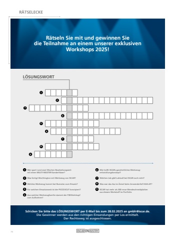 R%u00c4TSELECKER%u00e4tseln Sie mit und gewinnen Sie die Teilnahme an einem unserer exklusiven Workshops 2025!Schicken Sie bitte das L%u00d6SUNGSWORT per E-Mail bis zum 28.02.2025 an [email protected]. Die Gewinner werden aus den richtigen Einsendungen per Los ermittelt.Der Rechtsweg ist ausgeschlossen.L%u00d6SUNGSWORT1 Wer spart rund zwei Wochen Bearbeitungszeit mit einen MULTI-MASTER-Sonderfr%u00e4ser? 2 Was fertigt Worthington mit Werkzeug von ISCAR? 3 Welches Werkzeug kommt bei Bumotec zum Einsatz? 4 F%u00fcr welchen Einsatzzweck ist der PICCO3CUT konzipiert? 5 Aus welcher Werkzeugfamilie stammt der F3B-Bohrkopf zum Aufbohren? 6 Wie hei%u00dft ISCARs ganzheitliches Werkzeugentwicklungskonzept? 7 Welchen Job gibt%u2019s aktuell bei ISCAR noch nicht? 8 Was war das Ass im %u00c4rmel beim Anwenderfall HAVLAT? 9 ISCAR hat mehr als 300 neue Wendeschneidplatten aus diesem Werkstoff im Portfolio 54361289770